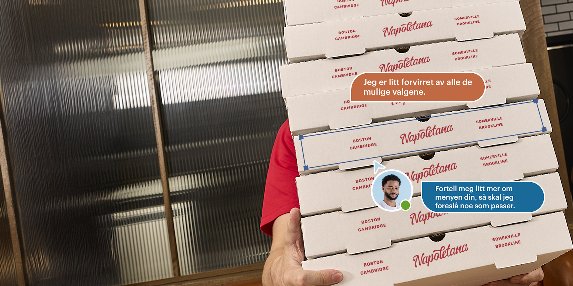 Med alle de nye takeaway-appene har det aldri vært viktigere å tilby takeaway. Hos VistaPrint finner du takeaway-emballasje du kan tilpasse slik at du kan knytte sterkere bånd til kundene dine og få dem til å huske deg bedre når de skroller gjennom appene sine. De solide pizzaeskene og burgerboksene våre holder maten fersk og trygg – og matbrettene og popkornboksene er perfekte for fingermat. Ønsker du å tilby en helhetlig opplevelse og gjør det enklere for kundene å ta med seg maten? Bæreposene våre med logo og serviettene med trykk setter et helhetlig preg på produkttilbudet ditt.