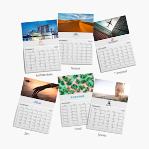Har du funnet et tema du liker? Velg mellom seks profesjonelle design – natur for velværebedrifter, transport for logistikkteam med mer. Temaene er gjennomgående for alle de 12 månedene. Bare legg til logoen din, velg antall og bestill, så sender vi deg kalenderne klare til bruk.