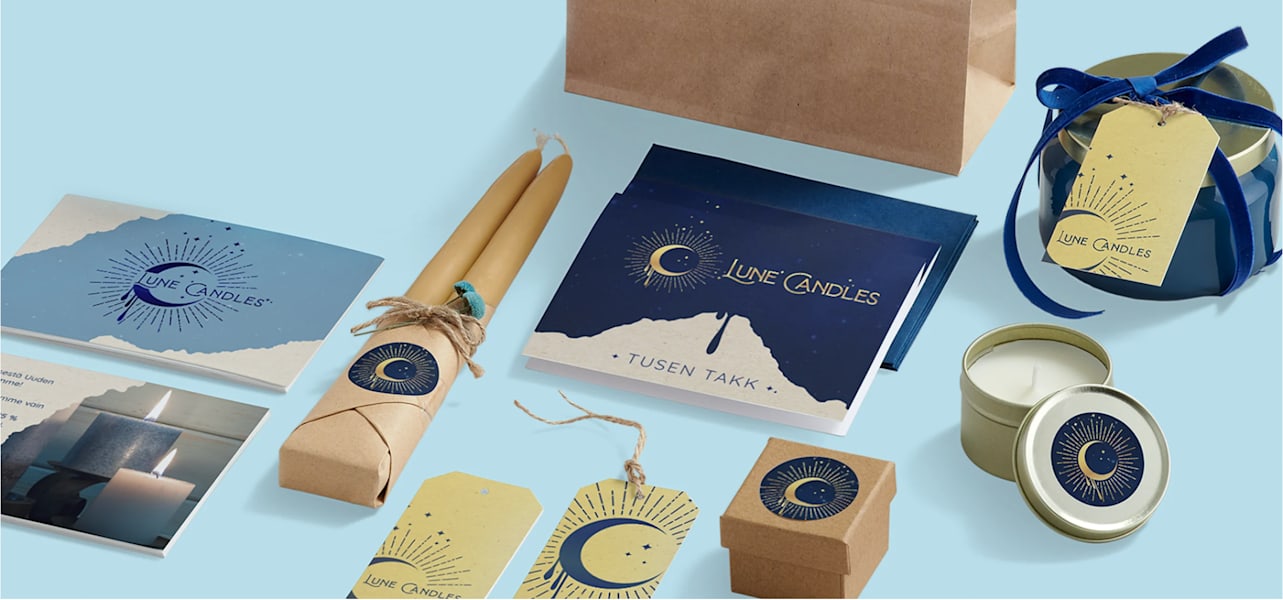 Det er mye å tenke på når du skal velge farger til merkevaren din – ønsker du energiske, varme fargetoner eller beroligende farger? Nyanser av blått passer bra for Lune Candles – de refererer til det himmelsk-inspirerte merkenavnet og de flotte fargene til nattehimmelen. Her bruker stearinlysfirmaet ulike nyanser av blått og merkevarens fargekombinasjoner til å skape dybde med de kreative emballasjeproduktene. Og takket være den sammenhengende fargepaletten, kan Lune mikse og matche for å lage klistremerker, hengelapper og postkort som alle er litt forskjellige, med allikevel helt i tråd med merkevaren.