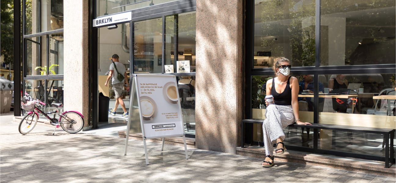 Sikkerheten har førsteprioritet for alle som driver små virksomheter, og det har skjedd store endringer for hva som er mulig for restauranter. Derfor kan det være smart å informere kundene om nye regler og retningslinjer før de setter seg ned for å spise. Sett opp et skilt utenfor inngangsdøren for å minne kundene på at de må bruke munnbind og desinfisere hendene før de kommer inn. Du kan også lime en vindusdekal med en QR-kode i vinduet, slik at kundene kan lese reglene før de kommer inn. Inne kan du bruke gulvdekaler for å sikre at kundene holder korrekt avstand.