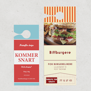 Klar til å begynne utformingen? Se de mange malene våre i ulike temaer og farger. Dørhengerne våre finnes i to størrelser: Liten (89 x 216 mm) og Stor (114 x 279 mm). Du kan tilpasse dem som du vil og legge til all infoen du trenger. Hvis du ikke finner et design som passer, kan du laste opp ditt eget design, eller be en av designerne våre om hjelp. Når designet er klart, tar vi oss av resten. Dørhengerne dine blir trykket i sterkt fullfargetrykk og leveres hjem til deg slik at du kan tiltrekke deg nye kunder.