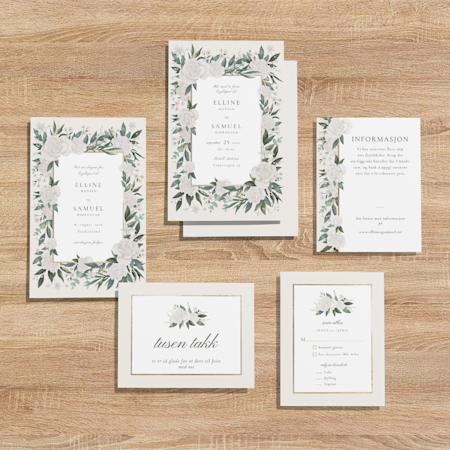 Begynn med å se gjennom invitasjonene våre. Finn en mal og tilpass den med dato, sted, informasjon om mottakelsen med mer. Du kan deretter videreføre designet til resten av bryllupsinvitasjonsproduktene, inkludert svar utbes-kort og konvolutter. Eller ta kontakt med teamet vårt – hvis du har en mal du liker, finner de alle de matchende elementene for å lage et fullstendig sett med skrivesaker til bryllupet. Har du lyst på noe litt mer eklektisk? Ikke vær redd for å blande ulike papirer for en morsom og moderne stil.