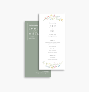 Vi har mange farger og design som du kan tilpasse til invitasjonene, bordplasseringskortene og resten av bryllupssakene. I bryllupsmenykolleksjonen vår kan du velge blant alle slags motiver, fra syrlige blomster, kule skrifttyper og botanisk tema. For ikke å glemme muligheten til å velge blant seks førsteklasses papirkvaliteter (vi tilbyr til og med perlemorglans).Velg et design og sett i gang