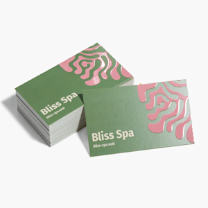 En bunke visittkort med UV-spot finish som reklamerer for et spa.